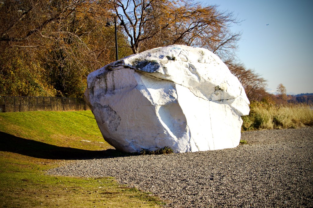 - Walking to Great White Rock, there’s a variety of surfaces. Paved sidewalk, grass, dirt path, and small rocks.