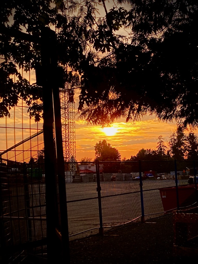 I walk around the corner and stop. Through a metal fence surrounding a construction site, I see it. The smile is inevitable, and so is the sigh. Past the barricade, machinery, and muddy pit, the sky is putting on a show. It’s like the Great and Powerful It took up painting.